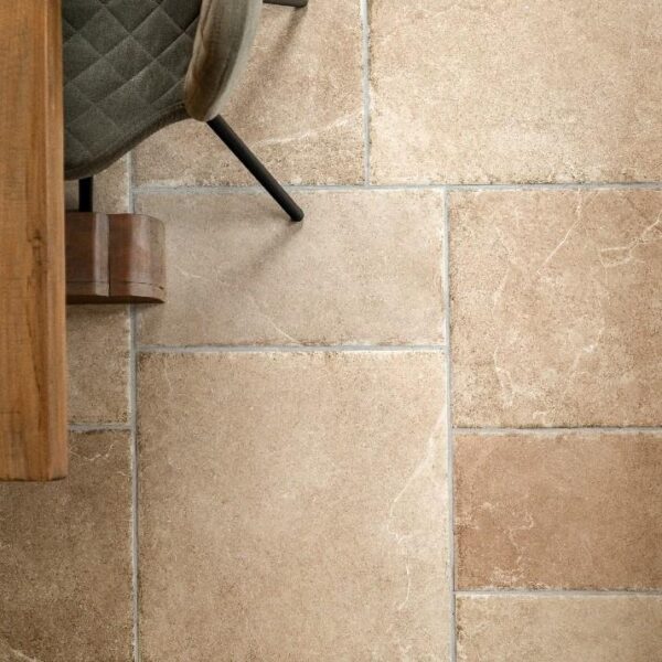 Breng karakter en warmte in uw interieur met Castello Mokka, een hoogwaardige keramische vloer uitgevoerd in het populaire Romaans Castel-Stone verband. Deze tegelserie combineert drie perfect op elkaar afgestemde formaten — 60×90 cm, 60×60 cm en 30×60 cm — die samen een levendig en authentiek patroon vormen. U ontvangt een zorgvuldig samengestelde mix van deze maten, handmatig geselecteerd door onze specialisten voor een optimale balans en een prachtige, natuurlijke uitstraling.